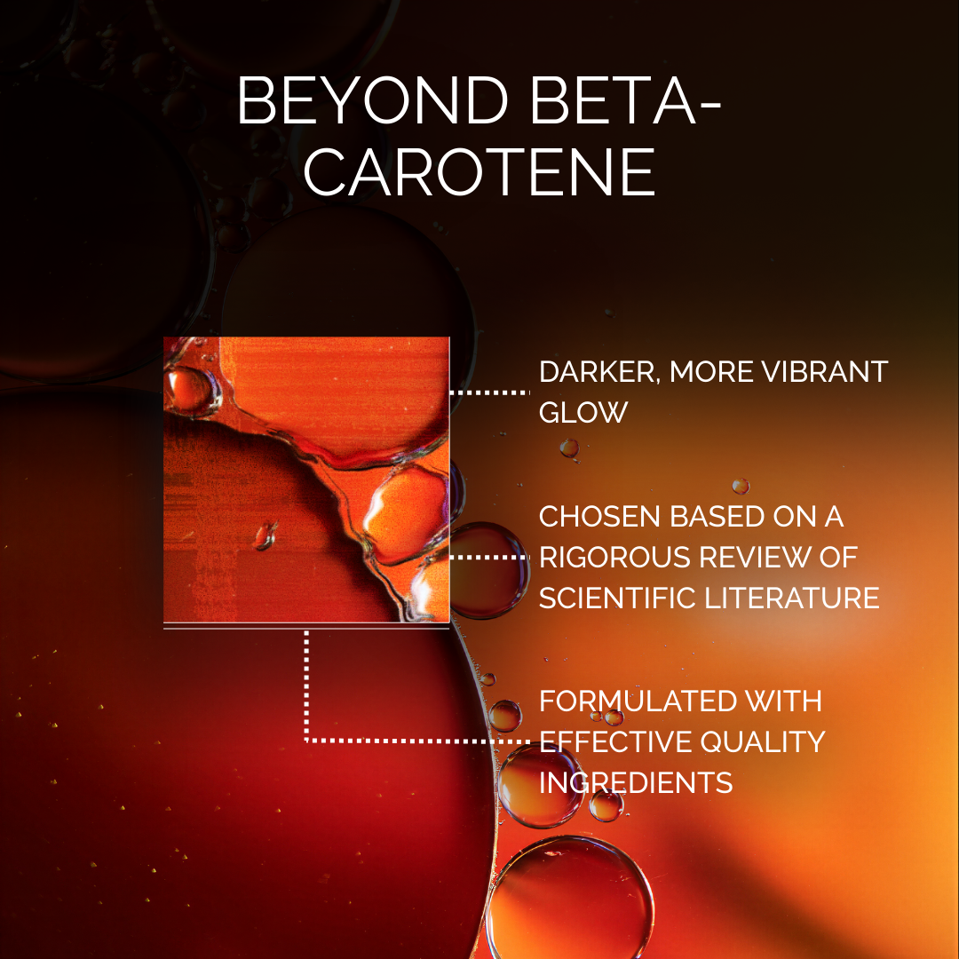 Beta-carotene has decades of proof behind it. It is the most commonly used carotenoid. Carrot pigment alone produces carrot-colored skin. We include it at a supporting dose, enough to build the golden base layer. Darker pigments, lycopene and astaxanthin, create the final natural, attractive tone.